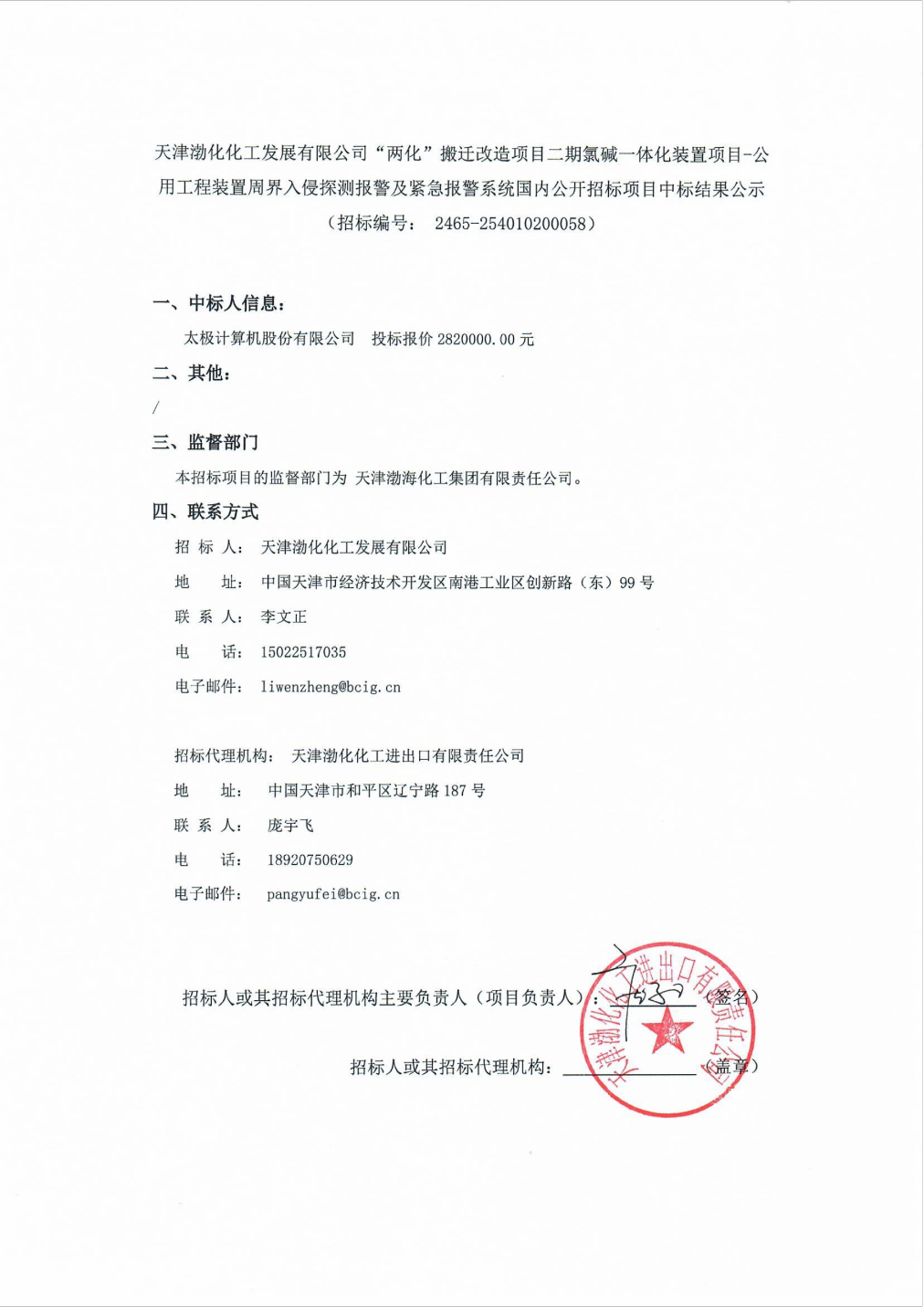 太极股份中标成果:天津渤化化工发展有限公司“两化”搬家改造项目二期氯碱一体化设备项目-共用工程设备周界侵略勘探报警及紧迫报警体系国内揭露对外投标中标成果公示